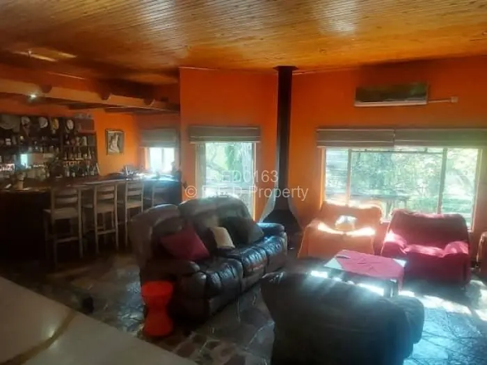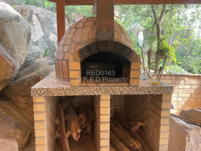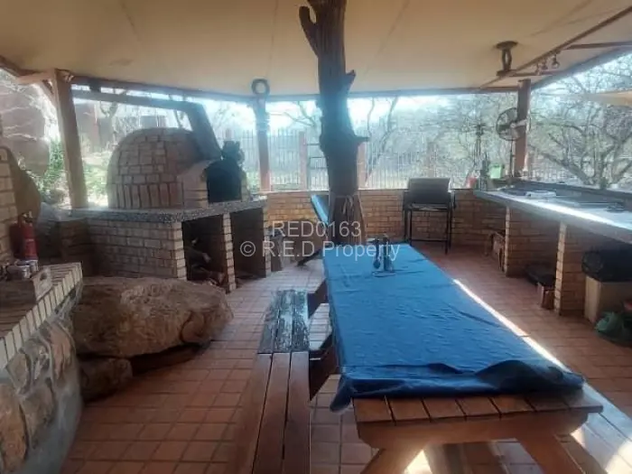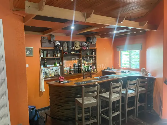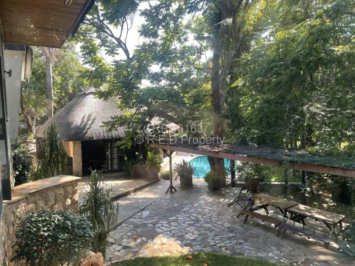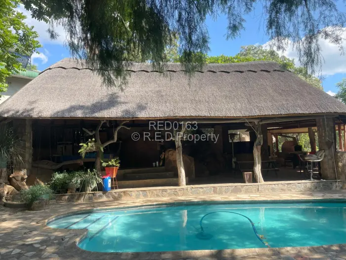 Downstairs is an incredible thatched outdoor entertainment area, with stunning views overlooking the sparkling swimming pool and dam area.... Within the entertainment area is a kitchenette, featuring a braai area and pizza oven and sink, for fun entertainment there is space for a large snooker table, there is also a rocky waterfall feature. You may relax in the decadent jacuzzi adjacent to the swimming pool and there are two different seating areas, imagine a beach setting, sand on your toes, sun downers around the fireplace, overlooking the dam at sunset?