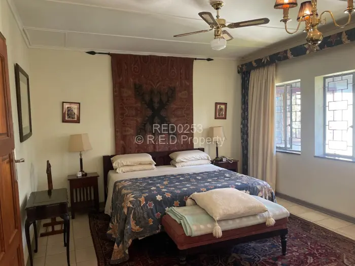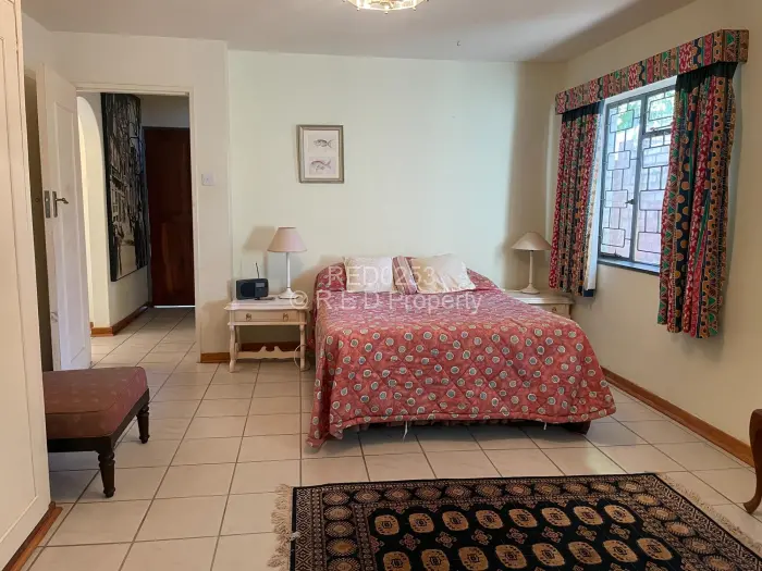Outdoors, the lush, irrigated garden is a standout feature, with a timed irrigation system, a tranquil pond with a fountain, and a borehole ensuring year-round greenery. A sparkling swimming pool enhances the outdoor experience.