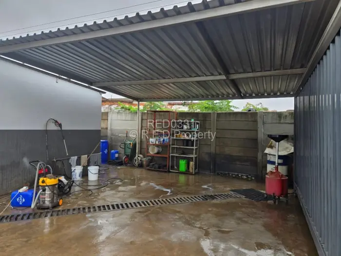 The fully tiled workshop includes a service pit and roll-up garage doors for easy access, complemented by a double carport. Staff amenities include separate male and female bathrooms and change rooms, a staff kitchen, and three staff rooms at the rear. The property is walled on three sides, secured with electric fencing and CCTV (indoor and outdoor), and further supported by a 3. 5kVA solar system and an equipped borehole.